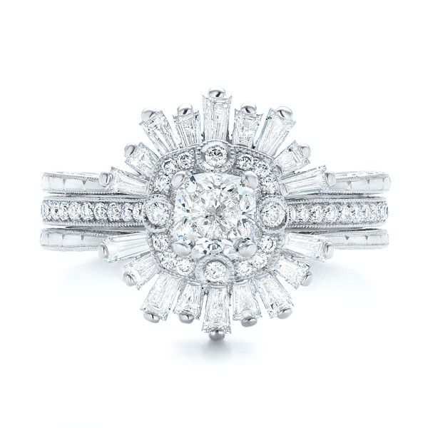 This dazzling women’s wedding ring features baguette diamonds in a starburst pattern, set in a yellow gold jacket that fits perfectly around the engagement ring. We created it for a couple from Los Angeles, CA for whom we had previously made the matching engagement ring. They loved the first piece so much, they came back to us when it was time to complete the set, and we designed it for them based on the inspiration piece they provided. Design Your Own Wedding Ring