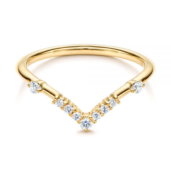This lovely diamond wedding ring features a V-shape to contour an engagement ring with diamonds scattered along the top.